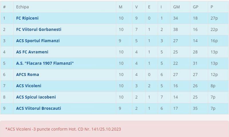 Liderul la zi pare de neoprit, experimentata echipă de la Vârfu Câmpului reușind să treacă în această rundă de Inter Dorohoi cu scorul de 3-1. Surpriza etapei însă a avut loc la Tudora, acolo unde Unirea Curtești reușește să obțină în extremis un punct.