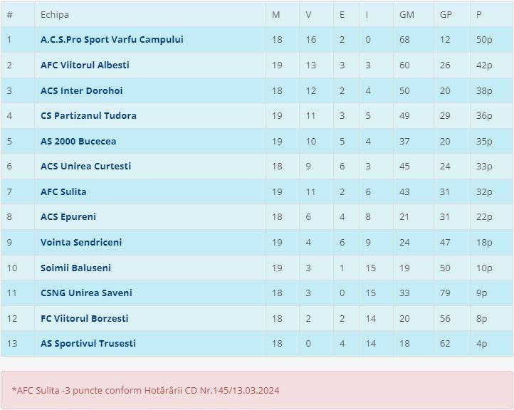 În runda cu numărul XX, Pro Sport Vârfu Câmpului face scorul campionatului de până acum, în deplasarea de la Săveni, 9-1. Aceștia profită de pasul greșit făcut de Viitorul Albești, care termină la egalitate pe teren propriu jocul cu AFC Sulița și se distanțează la opt puncte în fruntea clasamentului, având și un joc mai puțin de disputat. Inter Dorohoi se impune la lanterna roșie, 3-1 iar Unirea Curtești primește cele trei puncte la masa verde deoarece Șoimii Bălușeni s-a retras din campionat imediat după începerea returului.