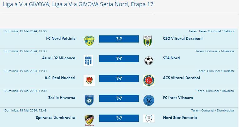La liga a V-a, în ambele serii lupta pentru promovare s-a terminat. FC Ripiceni din seria sud și FC Nord Păltiniș din seria nord s-au desprins decisiv. Dacă pentru echipa din Ripiceni este un debut în liga județeană, cei din Păltiniș revin după o pauză destul de îndelungată.