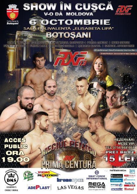 RXF 13, cel mai important eveniment de MMA (arte martiale mixte) din România, va avea loc în data de 06 octombrie 2014, începând cu ora 19:00, la Sala Polivalentă „Elisabeta Lipă” din Botoșani. MMA-ul este sportul cu cea mai mare creștere la nivel mondial, fiind o combinație între cele mai cunoscute sporturi de contact din diferite ramuri ale artelor marțiale, printre cele mai cunoscute numarându-se karate, jiu-jitsu, judo, kempo, mhuay-thai, kick-box, dar și lupte libere, box, lupte greco-romane etc.